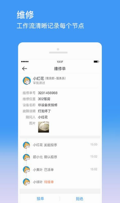 3、为用户显示各个维修单的详细信息,用户可以看到维修单流程,快速进行接单;