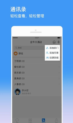 4、提供通讯录版块,用户在这里能够看到各个部门的联系人信息,更轻松的进行联系;