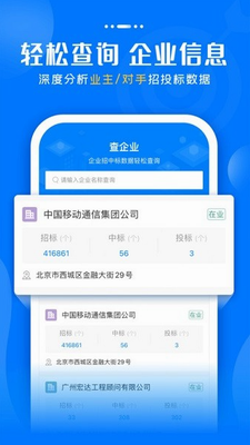 提供企业信息、相关人员资质的查询,以及标书服务、招标定制、业主监测、竞争对手监测等业务。