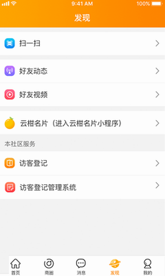 3、集成了云柑社区、云柑访客、云柑名片、云柑5G云店、云柑组织等应用服务;