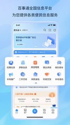 百事通app下载手机版是一款全国性的信息服务软件,涵盖的信息服务非常全,和本地宝差不多类型的,但是更专业的提供生活服务信息,包括全国招聘求职、租售、二手服务、本地活动等等,让我们的生活更加的智能化和方便快捷。平台以创新的理念、国际化的视界、先进的科技水平, 实现对中国广大网友、微商阶层和成长性人群的财富增值与传承,全心全意为消费者服务,把便捷、实惠、安全、财富带给全国人民,快来下载试试吧。