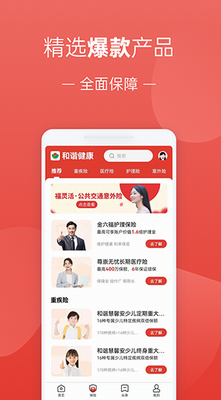 1、在首页中为用户推荐各种精选保险,让用户能够快速购买更优质的保险产品;