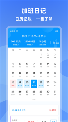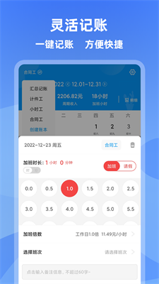 1、全智能记录加班时间,支持日历查账,收入支出一目了然。