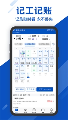 2、记工流水方便工人一目了然查看当月出勤以及工钱。