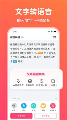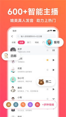 配音神器免费版下载手机版是一款为用户提供广告配音、文字配音、视频配音、录音、宣传片制作等功能的应用软件,您只需要在app中快速的导入文字内容以后,app就会进行文字转语音,让您可以轻松的获取语音朗读内容,这样就能在线快速的获取语音信息了,简洁简洁清爽且功能强大,操作简单易用,拥有海量样音文案模板,覆盖了广告促销、地摊叫卖、美食餐厅等各个领域都应有尽有,优质的背景音乐,还提供了多种男女中文、方言、童声等数十位智能合成机器发音人、语音声任你随意切换选择。