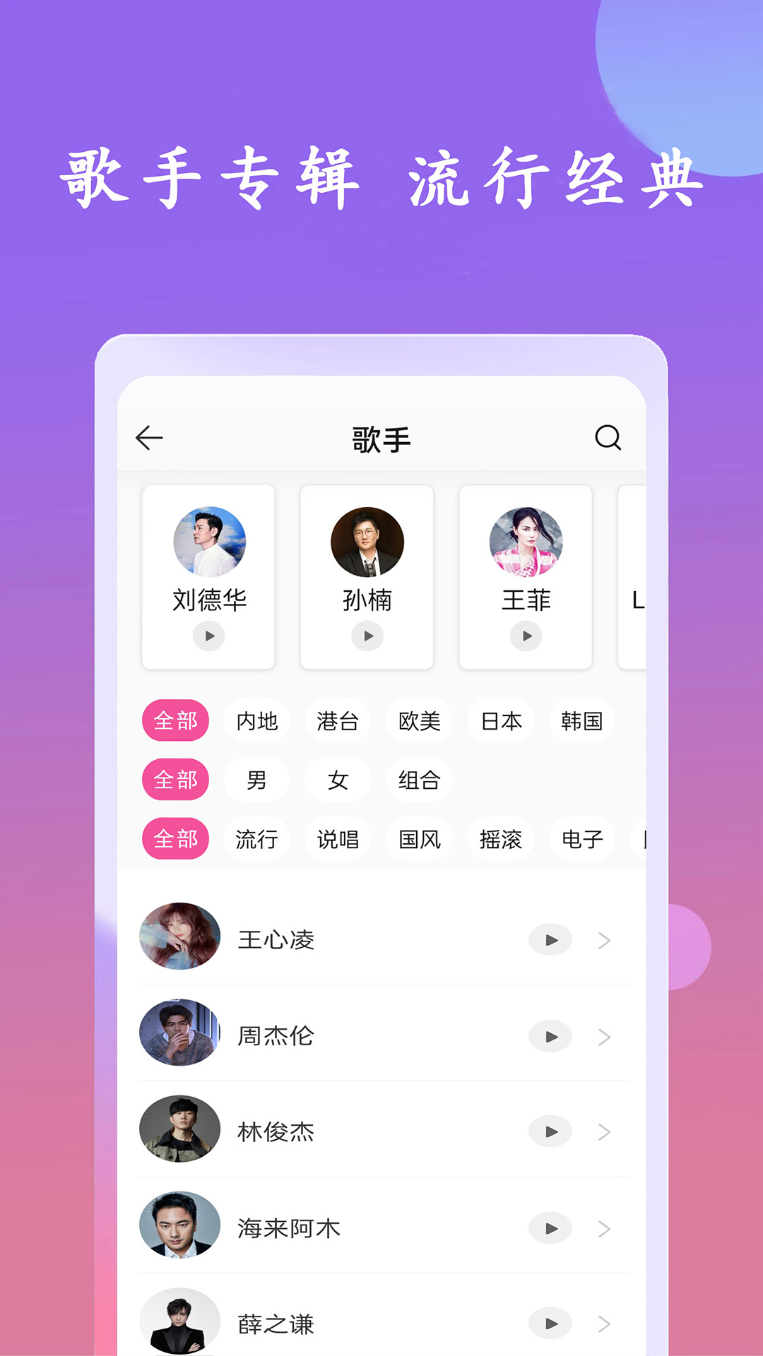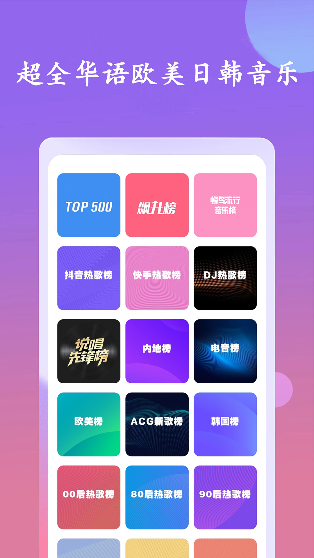 2、覆盖各种流派,不同的分类和榜单也是为你提供,搜索播放听歌会满足用户不同的音乐喜好。
