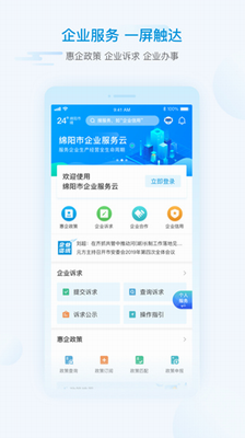【营商服务】绵阳市企业服务云提供企业诉求提交、惠企政策精准查询、企业帮办代办、企业合作平台、中小企业扶持、融资、税务、法律等企业全生命周期办事服务,让企业享受“指尖办事”的便利。