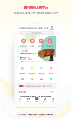 面料展官网下载免费版为大众提供一站式面料、服装展览平台,在这里你可以查询到众多会展的展品信息,还可以详细便捷的观摩展品,平台还会根据会展更新而进行更新,让大众感受最前沿的时尚感,用户还可以在平台进行会展观看,平台拥有观众预登记、在线逛展、人脉共享、商贸配对、线下邀约等等功能服务,可以给予用户更棒的参展、参观效果,能够在手机上查看最新的面料会展动态,支持在这里查看详细的展品信息,支持在线进行对接,有贴心的展商列表,可以按照自己的需要定向搜索感兴趣的展商和展品。