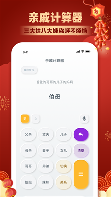亲戚称呼计算器免费版最新版能够帮助用户解决过年不知道如何叫人的尴尬,通过该软件用户只需要输入相关人物的关系软件将会快速为你进行生成,使用起来非常的方便,而且软件的体量非常的小,软件收录的关系多达几千条,完全可以解决生活中的常见称谓,有了它以后收红包再也不怕叫错称谓,走访亲戚面对三姑六婆也不再尴尬了,解决你的不会称呼的尴尬烦恼,使用起来也简单,超多的功能提供给大家,让你可以高效的进行称呼的计算,搞清楚亲戚们的关系。