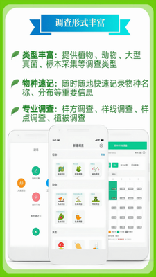 1, 丰富类型:提供植物、动物、大型真菌、标本采集等多种调查类型