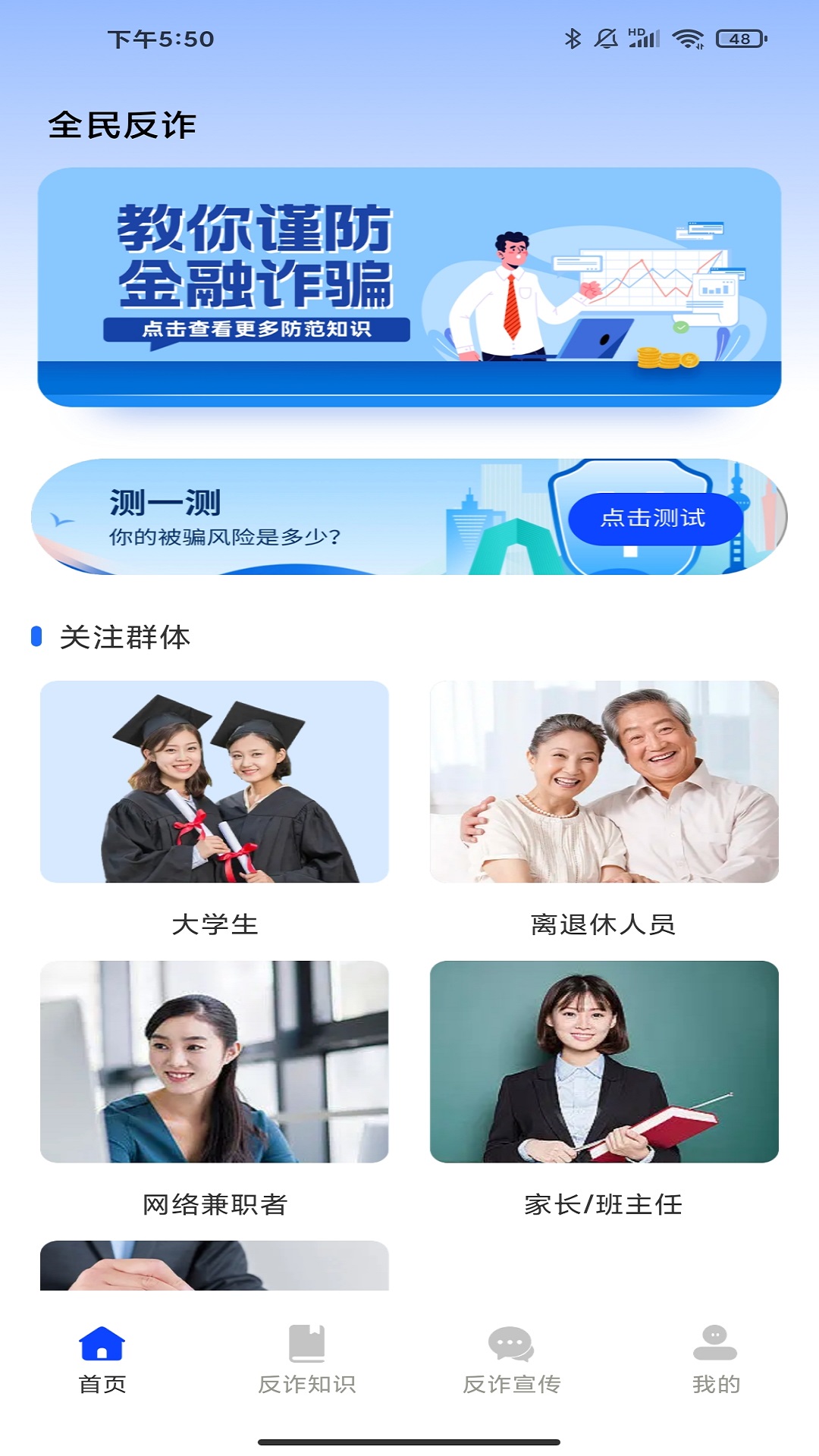 金钟反诈卫士app是一个全新的反诈骗平台,这里提供了丰富详细的诈骗案例让大家了解,也有专业的警察人员在线为大家解读各种诈骗案例,帮助大家提高防诈意识,软件首先会检测用户的被诈骗的可能性,然后会根据群体推荐相关资讯,以此来提高用户的反诈意识,还有海量的防诈小知识可以在线学习哦,超级的方便好用,有需要的朋友可以来下载试试吧。