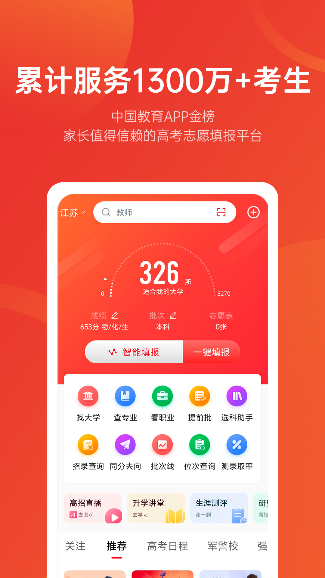 1、找大学、查专业:当年招生计划、历年院校分数线、专业分数线尽在掌握。专业介绍、开设院校、就业前景、薪酬分析报告一站式查询