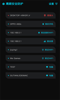 2、户可使用鹰眼安全防护检测当前环境.同局域网下是否存在隐藏摄像头,防止个人隐私外泄。