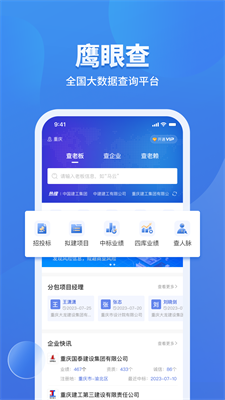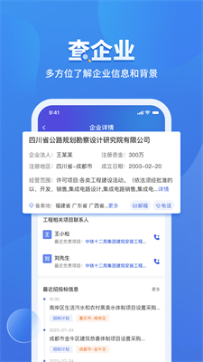 鹰眼查官网下载安卓版是一款专业精准的招投标信息查询好帮手,提供全国建筑企业的中标信息,企业荣誉,资质等级,联系方式等信息的查询,不管您在开标现常还是在工地,或者是出差的路上,您都能随时随地查询到建筑企业的相关信息,通过鹰眼查app随时查询全国建筑企业中标信息,还可以查老板,查资质,充分了解企业背景,功能广泛而全面,为用户提供了便捷的途径,使他们能够更加方便、高效地获取和了解建筑企业的相关信息。