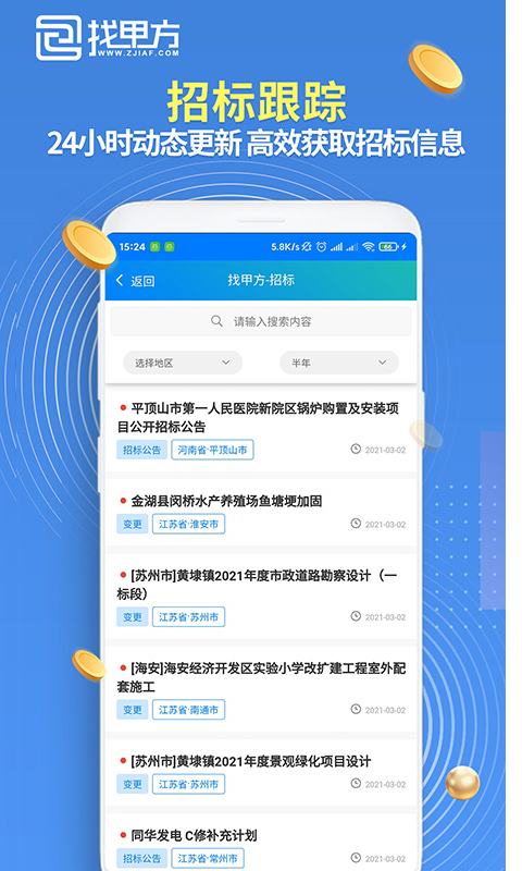 找甲方app官方版是中项永达科技(北京)有限公司推出的一款找工程建筑项目的大数据平台软件,专门为乙方提供各种商机需求服务,设置了招标公示、中标公告以及最新批复多种服务专区,这个软件每天都会更新海量的信息,最新的批复信息一目了然,帮助您轻松订阅找到商机,企业或者个人可以根据自己的实际情况在线联系对方,如果感兴趣的话,那么现在就来下载体验吧。