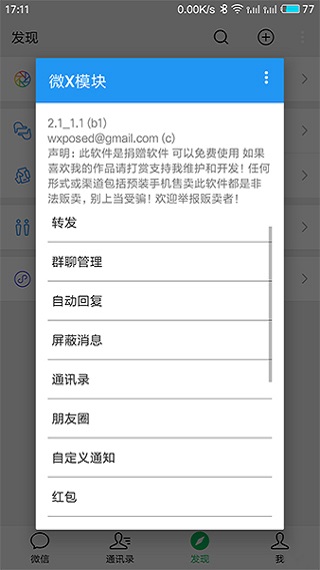 2、这里的模块非常多样化,几乎包含所有内容,无论是抢红包还是自动发消息,都是可以的。