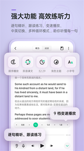 四六级考研、雅思托福、BEC、口笔译……国内外考试的听力真题和备考资料,配合全方位精听泛听功能,听力提升更高效;