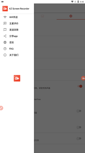 3、AZ Screen Recorder原生无广告,且不会添加任何录制水印,非常好用。首次启动,如果界面是英文的,大家点击软件设置里的左上角菜单栏,进入language,切换到中文即可。