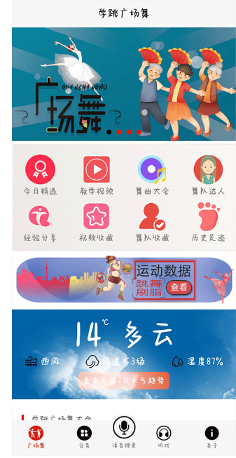 1、进入学跳广场舞,首页有广场舞教学、广场舞推荐、广场舞达人发布的视频以及经验等功能。