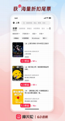 摩天轮票务app最新版是一款实用的在线购票软件,以线上电影、演出相关票务服务为出发点,打破以往繁琐的线下票务办理服务模式,90%以上的演出均有折扣,让消费者实实在在享受实惠,一键查询附近影院、电影场次、快速选座买票之外,还能全方位享受舒适、贴心的周边配套服务,有需要的朋友们快来下载体验吧!