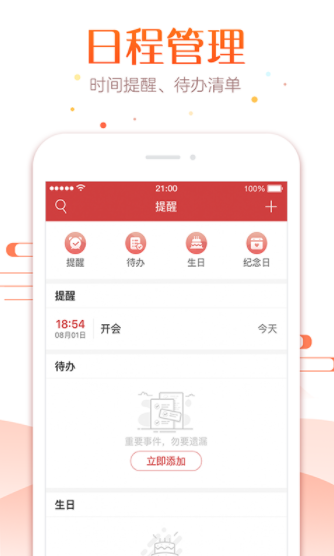 2、 提醒:会议、记事、待办、日程管理、生日提醒、日记本;