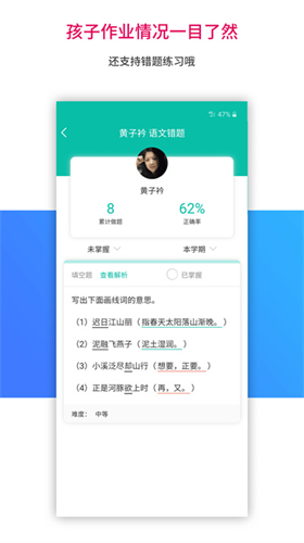 3、学生和家长可以利用乐教乐学进行游戏化学习;完成作业;进行教材同步练习;参与活动;展示才艺;了解孩子学习情况;了解学校、班级动态;亲子互动学习等功能。