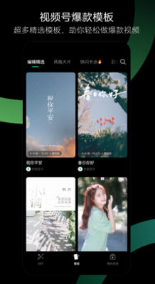 2、在编辑页面中,为用户准备了不少视频模板,用户要做的就是选择一个自己喜欢的套用上去即可。用户可以直接将剪辑好的的视频作品发送到微信的好友、朋友圈和视频号中,从这方面来说,它也可以认为是微信视频号的绝佳搭配,乃至御用入口。