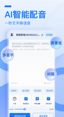 2、智能配音:采用AI技术,可设置多音字、间隔、音效等参数,高度拟人化。