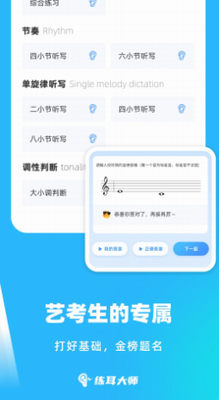 4、艺考集训:软件包含了艺考乐理套餐、艺考练耳套餐、艺考视唱套餐,为艺考生和量身打造,海量 乐理、视唱练耳 题库和讲义,有效帮助您学习和练习音乐基础知识;迅速提高考试成绩,让考级更容易,乐理初、中级 ,练耳初、中级,视唱初、中级。