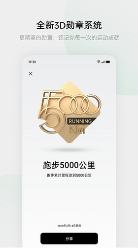 3、全新3D运动勋章:软件有更精美的勋章,记录你一点一滴的运动成就。每个运动精彩时刻,每个运动里程碑, 我们都会送上精美勋章,快来点亮自己的运动勋章吧。