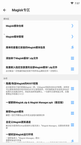 1、ROOT专区:一键修补boot镜像注入magisk、一键往卡刷包里注入magisk.zip、一键签名卡刷包里的boot.img、验证/签名boot镜像、一键将系统ROOT转换为Magisk(即使在无Recovery情况下)。