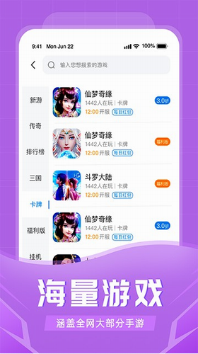 2、类型丰富:内含传奇,仙侠,策略,三国,休闲,魔幻,回合,挂机,卡牌等千余款福利游戏。