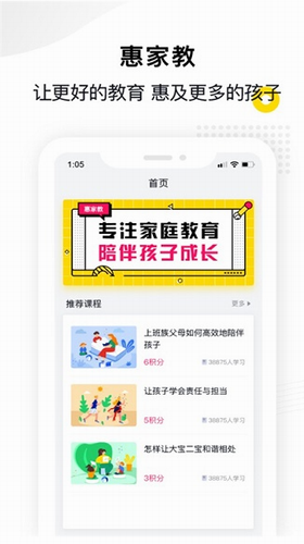 《惠家教app2.0官方版下载安卓》是一款功能强大实用的在线辅导学习APP,这款软件可以为用户带来更便捷的服务,家长们可以获得更多的学习解决方案,让用户随时可以用手机轻松学习,为更多用户带来便捷的服务,随时满足用户的学习需求,同时这款软件为家长们提供孩子成长各阶段的解决方案,提供家庭教育普及视频课程,帮助用户更好的沟通交流,传播产生价值,帮助家长和孩子的健康成长,并且这款软件拥有丰富的教育资源,海量名师课程线上点击即可观看,面向青少年年龄段的学生,超多科目的视频可以选择,家长们能够在这里了解科学的教育方式,解决教育孩子的难题。
