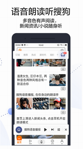 【语音朗读】应用搜狗领先的ai语音技术,新闻资讯/网文小说支持全文语音朗读,多种声音任你选,离线播报省流量。