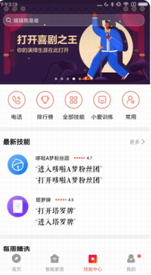 3、技能中心:帮你发现小爱已经集成的几十种能力,你想要,我们就给。小爱的能力仍处于快速扩充阶段,没事儿常来看看。