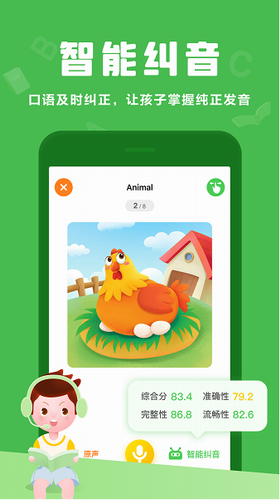 1、智能纠音:及时纠正,让孩子掌握纯正发音,并且这款软件还拥有精灵养成:收集精灵蛋,兑换喜欢的小精灵。