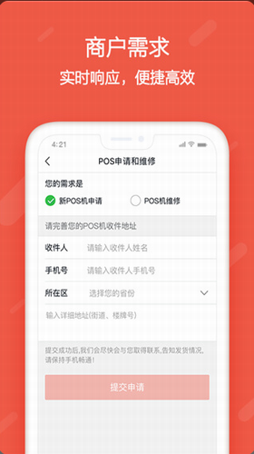 2、点击机具申请就可以进入POS机的申请和维修界面,填入相应的信息即可;
