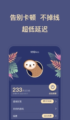 树懒加速器破解版是一款功能强大实用且可以提高手游的流畅度和稳定性的游戏加速工具,这款软件作为一个专门为外服游戏打造的加速器,软件根据用户所玩游戏会自动调节节点,从而更换好最适合游玩的ip,同时这款软件可还自行研发了网络优化功能,使你无需漫长等待,10分钟就能下好想要游玩的海外游戏,并且这款软件可以提醒你加速期限,以免自己的加速时间过去了,可以在这里填写邀请码,可以在这查看支持的游戏,还可以在这个界面升级VIP,此外这款软件专为游戏优化提供服务的应用软件,它会通过优化网络传输和提高游戏内部渲染速度等方式,来提高手游的游戏稳定性和流畅度。