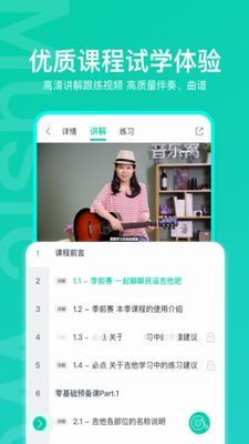 1、高质量的课程内容,让每一个学习的用户都能学好乐器,每次在线学习超便捷,高效学习。