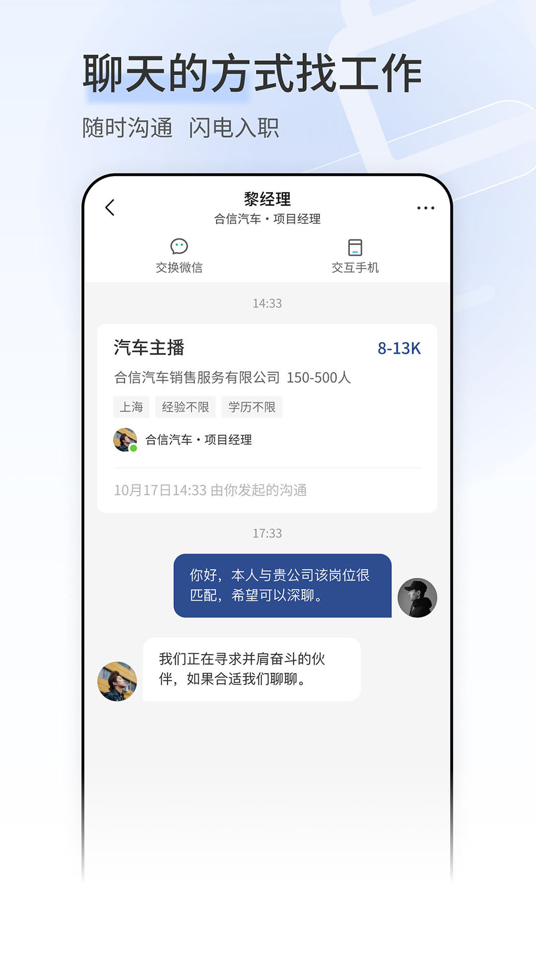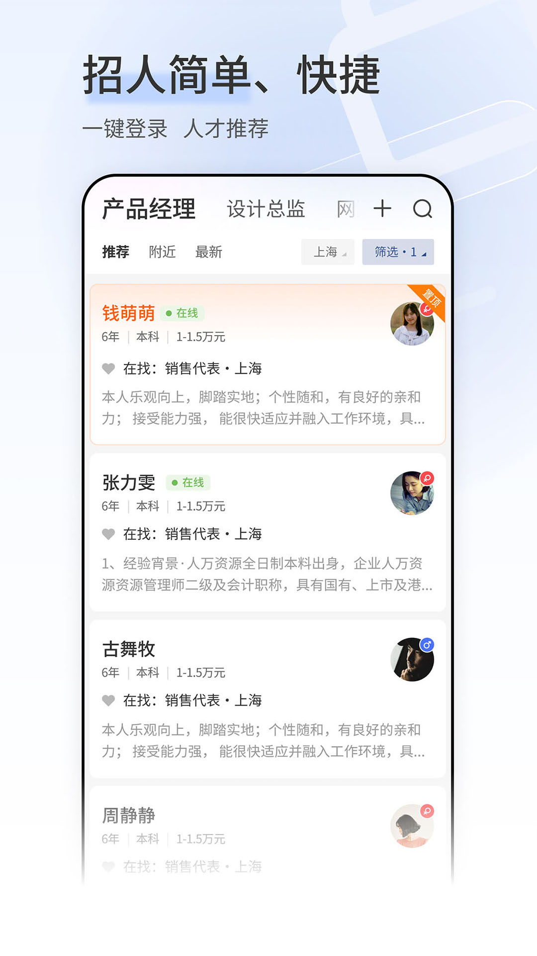 1、个性化推荐职位:根据用户的求职意向和个人简历,上海直聘软件可以为用户推荐最适合自己的职位,增加了求职的成功率。