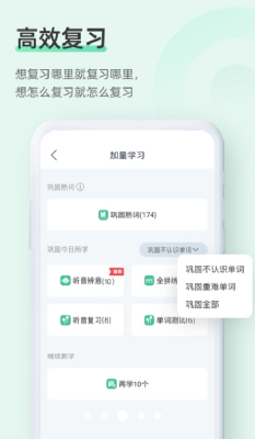 正常学习的流程外,对于还想要加练的同学,我们也提供了丰富的练习方式。你可以选择听音辨意、全拼练习、听音复习和单词测试这四种不同的练习方式,还可以选择只复习今天不认识的单词或者自己标注的重难单词。