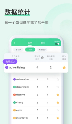 3、【智能复习】采用艾宾浩斯记忆曲线的方式帮助记忆,直到记忆词数达到七次才标记为掌握状态;另外,当用户掌握或学会的单词达到一定数量后,继续学习则会自动进入复习模式。