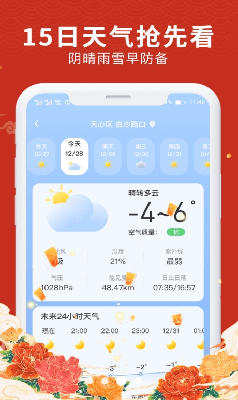 可以定位到城镇的天气预报功能拥有24小时天气、一周天气情况、生活指数、空气质量、风向风力、日落日出等信息,一站就能看全。