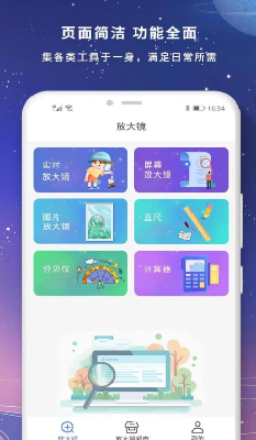 高清夜视放大镜最新版是一款根据阅读看书所需设计的手机放大镜工具,操作非常简单智能工具,用户可以在线设置各种数据一键快速放大,可以帮助用户提高操作效率,具备非常强大的智能搜索工具满足用户大部分需求,还有各种智能放大小工具分类分类清晰明了综合性非常强。在软件中可以运用各种各样的工具帮助用户轻松处理工作中、生活中、学习中等多种场景中遇到的问题,其中提供了强大的放大镜工具,能够运用放大镜工具将各种各样的物体多倍放大。给需要的用户朋友带来非常方便且实用的手机放大工具,不仅支持各种不同场合放大更有体积小巧使用简单的优势等等,无需复杂的操作就可以让你手机屏幕或者图片轻松放大达到想要的效果,让你的手机也能轻松成为放大工具,软件功能多多值得一试。可以帮助用户解决手机屏幕、文字、图片过小等问题,自由调节放大的范围,还可以开启实时放大功能,随时随地放大手机以外的物体,除此之外,还有手电筒照明工具,适合老年人使用,来即可安装。功能非常之强大,可以轻松放大图片文字,在拍照的时候还能放大光线的亮度,支持对图片进行调色处理,含有贴心的手电筒功能,在暗处也能看清。该软件带有放大和照明等功能,让爱看书爱阅读的你即使在黑暗环境下也可以放大文字进行阅读。你可以使用放大镜帮你看清书本上不清晰的小文字,也可以帮你轻松阅读药瓶或是其他物件上的细微文字说明,或是在黑暗的环境中充当手电筒给你带来光明。