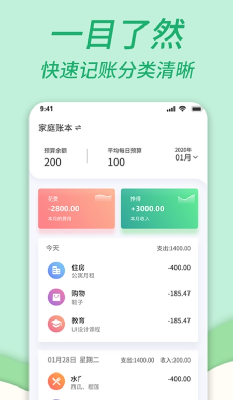 家庭记账本安卓版是一款深受广大用户喜爱的手机掌上全能记账工具软件,该软件的功能非常强大齐全,用户下载该软件后即可解锁全部功能进行使用,通过该软件随时随地进行家庭收支的一系列记账处理,将日常消费明细记录下来,并且非常具有可观性,可以帮助用户合理的制定出消费计划。软件简洁的记账流程,清晰的图表展示,让你随时随地掌握资金流向。在消费趋势里,它会自动生成收支统计图、年收支曲线图等报表,帮你快速分析消费情况;在日历查阅中,可快速查阅每月账单,每日开销明细一清二楚,其次,在这里你可以设置预算余额,自定义预算金额,监控消费支出,控制预算,保证财务健康。以上所述,只是这款家庭记账本软件的基本功能,更多功能展示还包括多账本记录,如记录公司账、生活账、装修、旅游、报销、生意、结婚等等,再有就是多人记账,通过邀请二维码可以加入账本,与家人、好友共同记账,有账大家一起记。最后就针对财务相关的工作者而言,为了统计与数据分析的方便,软件支持账本导出,一键Excel表格导出,整理数据更快捷,如果以上的功能介绍对你有所帮助,不妨试着培养自己家庭记账的好习惯,合理消费,才能让家庭生活更加的美满幸福。软件生成详尽的收支统计图和年收支曲线图等直观报表,掌握消费趋势,迅速分析财务状况,分账本记录,让你的账目井然有序,日历查阅功能,快速定位每月账单,每日开销明细一览无余,通过邀请二维码,轻松加入账本,共同打造财务自由。