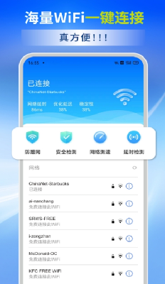 一键免费安全连wifi,你的手机上网管家,节省流量,随时随地免费连接优质wifi。