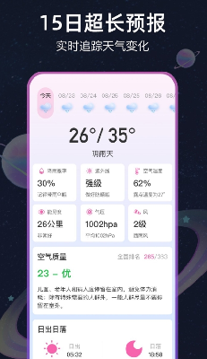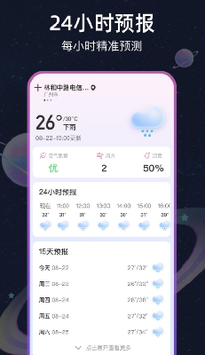 星云气象预报最新版是一款功能非常不错的天气预报查询软件,采用先进的人工智能技术,对各种气象数据进行深度分析,一系列的算法和模型保证了最精准的天气预报和预测。并且除了温度、降雨量等预警提醒之外,还支持,地震预警、台风预警等,可以让用户更加全面的了解天气变化状况。它不仅可以告诉你今天的天气情况,还能帮助你判断适合做事情,让你不再为选择困难而犹豫不决。 它每天都能为用户提供实时的日出日落、降雨概率、空气质量指数以及生活指数等天气数据资源,通过智能语音技术,可以实时播报天气情况,让用户轻松获取天气信息。软件给大家提供高精度的气象预报,提供24小时和一周的天气信息,有语音播报,非常的方便,APP有多种的数据来源,丰富的天气图标,动态效果,实用性非常的高。该软件界面简洁美观,操作使用方便,不仅为用户带来24小时天气、15天天气、30天天气等时限天气数据,还覆盖了国内外5000多个城市天气信息,天气信息准确全面,气象数据至分钟级和公里级,方便用户了解未来天气数据。除此之外,这款软件功能强大,可以观看各类视频资讯,影视、搞笑、音乐、小品等众多短视频随时查看,为您提供优质的视频观赏体验,可以打发您的无聊时间。同时星云天气app还提供受天气影响全国范围内的各地生活、旅游、交通、自然地理的变化状况,为你的旅游出行提供参考,是你日常出行必备神器。