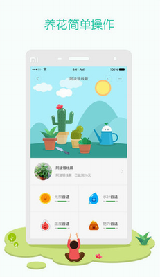 1、监测仪插入土壤中,与手机连接,从APP主界面中实时查看植物光照、水分、温度、肥力四项参数,使植物长期保持在合适的环境中生长。