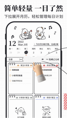 我要做计划app免费版是一款非常实用的记录事项软件,帮助你完成每天的计划安排和事项记录,记录你的生活和成长,不仅是帮你将生活变得井井有条的助手,也是你记录生活的笔记本。app界面简约可爱,主题丰富,可以轻松为你打造出不同的计划主题,高效管理设定的目标任务。在软件内将你的每日日程做一个安排,能够为你进行提醒,让你不忘记重要的事,能够锻炼大家的意志,让大家更加的专注自律,欢迎各位下载使用。