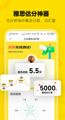 1、专属定位测评:土豆雅思软件拥有专属测评,并且10分钟即可以免费定位雅思阶段成绩。